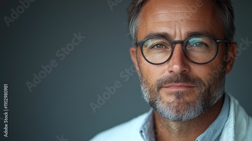 Professional male manager wearing eyeglasses and a white jacket against a simple gray background exuding confidence and expertise