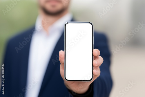 Professional Man Holding White Smartphone – App Mockup and Digital Communication Concept