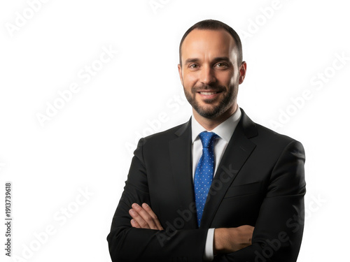Professional man in suit standing with arms crossed against a plain background isolated on transparent background