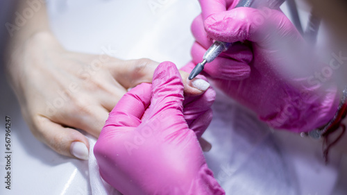 Professional manicure. Master does the removal of the varnish or base with typewriter from the last application. Filing nails with nail file. Repairing old gel nails with nail grinder in beauty salon.