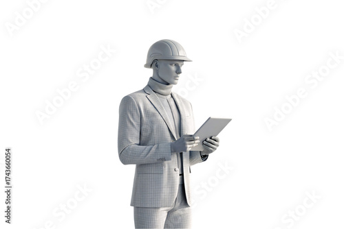 Professional mannequin wearing hard hat and checkered blazer while holding digital tablet, isolated on a transparent background