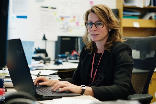 professional, mature, business, woman, employee, working, computer, office, middle, aged, tied-up, american, businesswoman, female, company, executive, using, laptop, manage, financial, project, sitting, desk, work, cyberspace, person, technology, secretary, men at work, looking, workplace, corporate, job