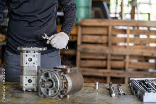 Professional mechanic man inspection hydraulic gear pump of wheel loader in workshop, repair maintenance heavy machinery