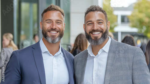 Professional men smiling at networking event, showcasing confidence and camaraderie