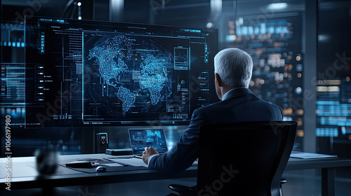 office, professional, man, datum, analysis, earth, map, technology, screen, modern, workspace, digital, corporate, business, computer, information, research, futuristic, design, communication, network, strategy, environment, monitoring