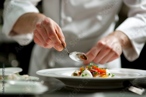 Professional Photography of a chef plating a dish. Capture the presentation and artistry, Generative AI