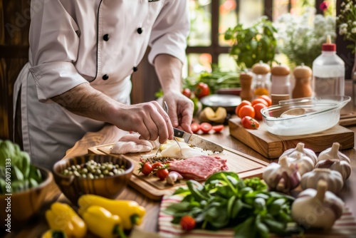 Professional Photography of a chef preparing a meal. Focus on the ingredients and cooking process, Generative AI