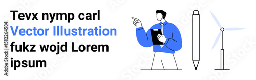 Professional pointing while holding a clipboard alongside a pen and wind turbine. Ideal for technology, innovation, business planning, clean energy, design, presentations, simple landing page