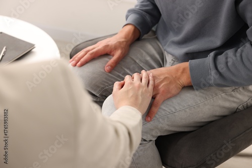 Professional psychologist supporting patient during therapy in office, closeup