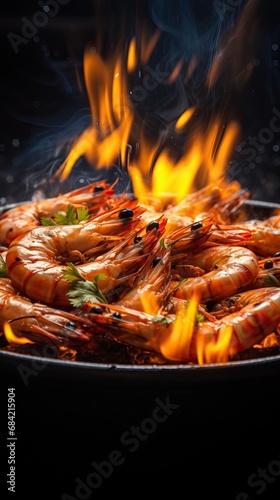 Professional Shot of Spiced Shrimps That Just Got Out of the Fire Placed on a Black Plate. Flames over a Fish Dish creating a Professional Image for Commercial Avertisement.