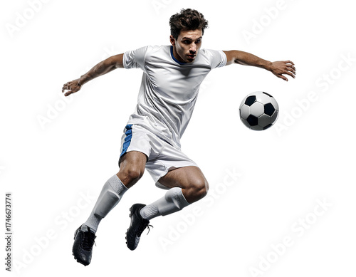 Professional soccer player performing a midair kick to strike the ball, isolated on a transparent background, PNG