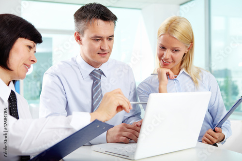 people, person, lifestyle, caucasian, formal, business, businessperson, woman, man, lady, men at work, white-collar, female, male, team, teamwork, group, collaboration, collaborator, cooperation, pointing, indoor, inside, office, corporate, corporation, modern, technology, laptop, computing, using, presentation, wireless, portable, tied-up, positive, cheerful, smiling, friendly, confident, successful, boss, colleague, job, occupation, professional, elegant, adult, project