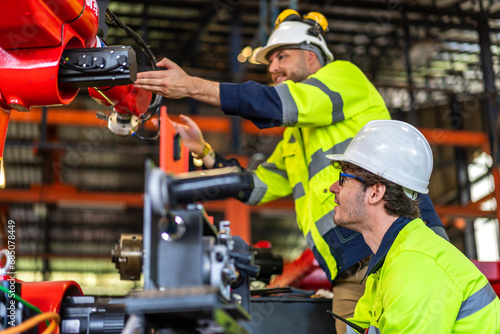 Professional team labor machanic engineer technician worker industrial work control with machine, manufacturing, factory, production line, Indusry 4.0, robot, industrial facility.business planning