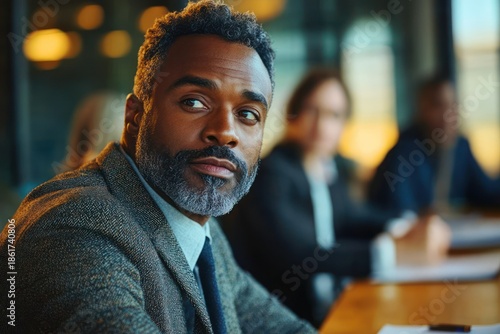 business meeting, professional, boardroom, teamwork, colleague, corporate, office, leadership, discussion, focused, attentive, serious, executive, suit, attaching, collaboration, strategy, planning, indoor, evening light, wooden table, notebook, pen, laptop, bokeh, meeting room, formal