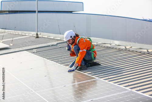 professional technician or engineer installing solar panels, Alternative energy for installed solar panels in use on roof of home