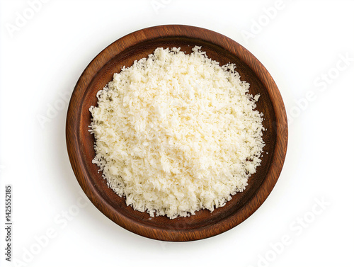 professional top view photo of grated white parmesan on a wooden plate in a white background, expensive premium quality, hyperrealistic photo