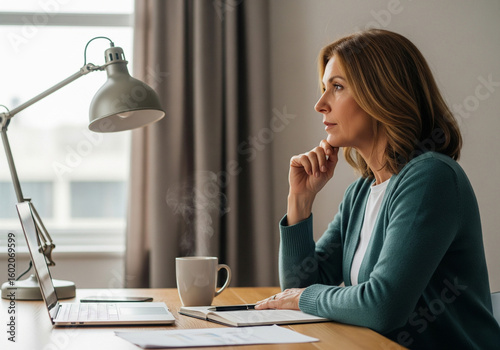 Professional woman in thoughtful pose at her desk with a cup of tea