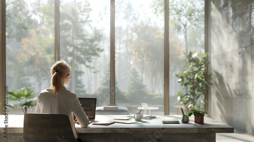 woman, desk, laptop, working, office, nature, forest, bright, light, workspace, productivity, modern, contemporary, professional, scenery, green, tree, plant, concentration, solitude, design, outdoors, urban, environment, technology, sharpened, glasses, serene, peaceful, daylight, atmosphere, foliage, creative, quiet, landscape, interior, minimalism, inspiration, fresh air, motivation, job, career, leisure, well-being, calmness, home office, generative, ai