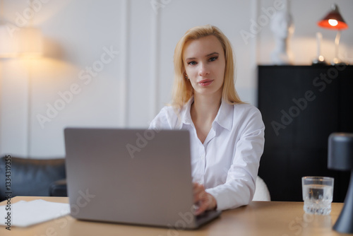 businesswoman, office, laptop, working, professional, female, young adult, entrepreneur, technology, workplace, desk, casual attire, modern, confident, white shirt, focused, productivity, woman, indoor, home office, typing, cyberspace, communication, career, lifestyle, digital, corporate, employee, business, freelance, concentration, person, job, executive, manager, success, occupation, workspace, interior, career woman, business attire, startup, innovative, efficiency