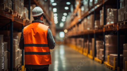 Professional worker wearing safety vest and hard hat looking information the tablet. In the background big warehouse with shelves full of delivery goods.