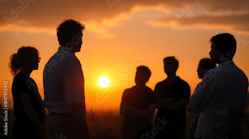 professional, silhouette, puckered, discussion, field, sun, set, warm, glow, sunset, sky, cloud, light, horizon, dusk, twilight, gold, hours, grass, nature, outdoors, atmosphere, evening, natural, landscape, rural, group, people, team, meeting, strategy, planning, gathering, conversation, communication, togetherness, standing, silhouette, observing, listening, interact, colleague, business, manpower, teamwork, leadership, guidance, calm, serene