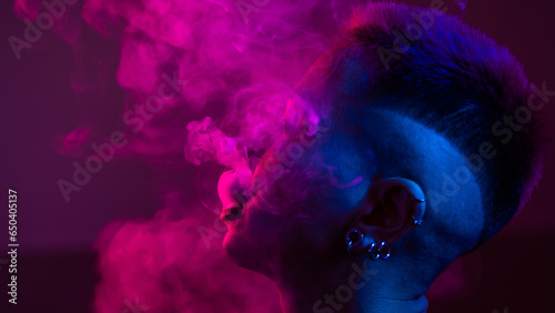asian, woman, short, haircut, smoking, neon, light, portrait, cigarette, nicotine, creative, habit, vapour, vaporizer, tobacco, hookah, female, steam, club, night, fume, hobby, blue, pink, red, trendy, illumination, colourful, chinese, japanese, fog, disco, passion, addiction, music, elegant, girl, coiffure, bad, profile, skin, lady, piercing, hipster, earring, male, boy, bizarre, man