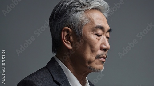 asian, grey hair, contemplation, profile, serene, introspection, wisdom, mature, thoughtful, elderly, age, photogenic, focused, character, expression, male, serious, stylish, head shot, facial features, individual, pensive, reflective, sophisticated, zen, calm, depth of field, dark background, businessman