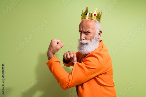 Profile photo of funny showman golden crown flex show biceps wear orange suit isolated on green color background