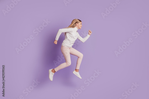 Profile photo of positive sportive lady jump run wear white jumper posing on purple background
