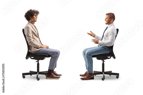 2, adult, background, boss, businessman, candidate, career, caucasian, chair, communication, concept, conversation, co-worker, employee, expert, full, furniture, gesture, goggles, hair, interview, isolated, job, length, listen, man, manager, occupation, office, opposite, people, person, profile, seat, sitting, talk, wheel, white, work, men at work, young