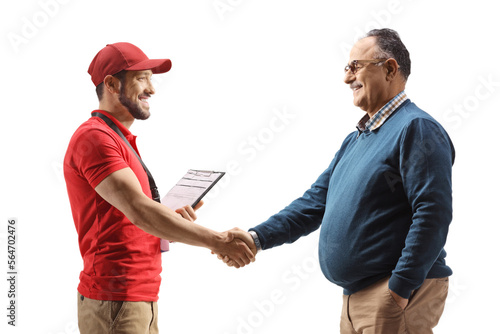 Profile shot of a delivery man shaking hands with a mature man