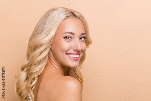 Profile side photo of cute charming lady with bare shoulders perfect smooth skin isolated on beige color background