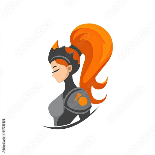mascot, logotype, warrior, female, profile, character, design, illustration, armoring, helmet, lady, fighter, knight, icon, graphic, image, portrait, stylised, silhouette, strong, powerful, courageous, fantasy, red, orange, hair, tail, art, figure, drawing, digital, representation, creative