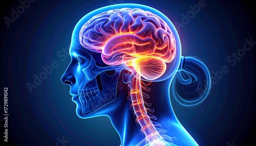 Profile view of human head with glowing brain and spinal cord—symbolizing neural activity, cognition, and central connectivity.