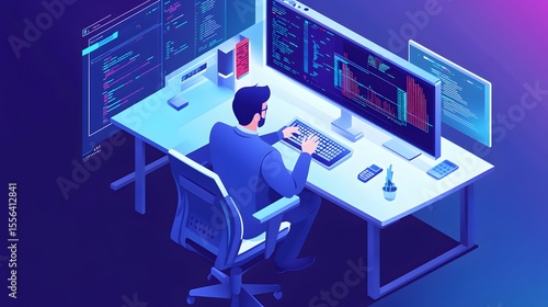 Programmer at Work: A focused programmer sits at his desk, immersed in lines of code displayed on multiple monitors. The scene is illuminated with cool, vibrant colors.