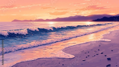Prompt 1: "A serene beach scene at sunrise with gentle waves lapping at the shore, the soft orange and pink colors of the sky reflecting on the water's surface, and distant mountains on the horizon.