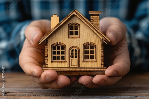 closeup, hand, cradling, small, wooden, house, model, table, protective, gesture, care, security, homeownership, detailed, window, door, wood grain, texture, person, blue, contrast, warm tones, comfort, stability, model house, protection, home