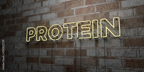 PROTEIN - Glowing Neon Sign on stonework wall - 3D rendered royalty free stock illustration. Can be used for online banner ads and direct mailers..