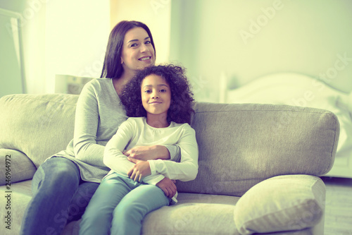 mother, motherhood, adult, caucasian, daughter, mixed race, children, childhood, family, love, support, oneness, happy, upbringing, adoption, foster, custody, care, culture, race, diversity, tolerance, hug, equality, home, house, apartment, couch, sofa, biracial, woman, girl, loft, brown, joy, cheerful, bed, bedchamber, brown hair, afro, children