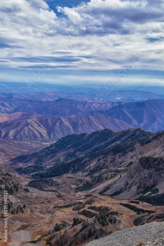 Provo Peak views from top mountain landscape scenes, by Provo, Slide Canyon, Slate Canyon and Rock Canyon, Wasatch Front Rocky Mountain Range, Utah. United States.