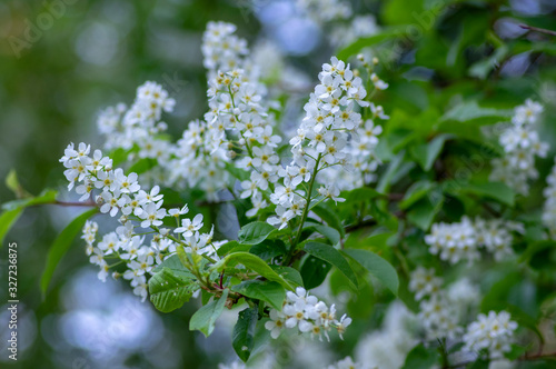 Prunus padus white flowering bird cherry hackberry tree, hagberry mayday tree in bloom, ornamental park flowers on branches
