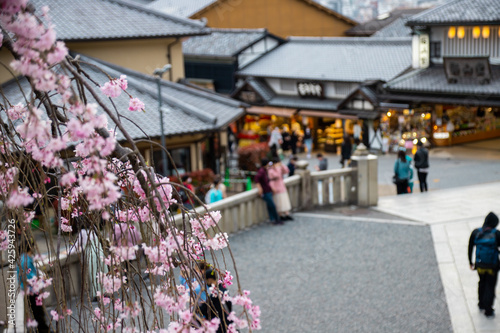 Prunus Pendula (Shidare Sakura or Zakura, weeping cherry tree) with blurred background at Kiyomizuzaka in Kyoto, Japan. Kiyomizuzaka is the street of Kiyomizu Dera Temple's Monzen-machi (temple town)