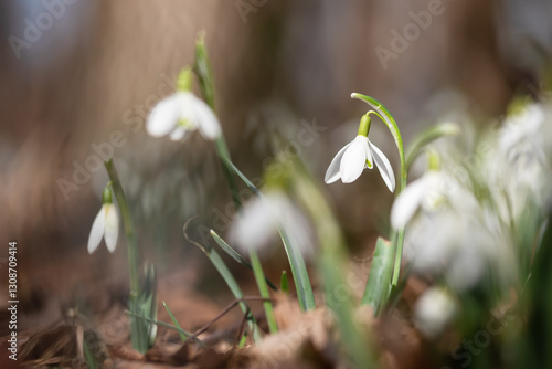 Przebiśniegi w lesie, wiosenne tło, wiosna 2025.