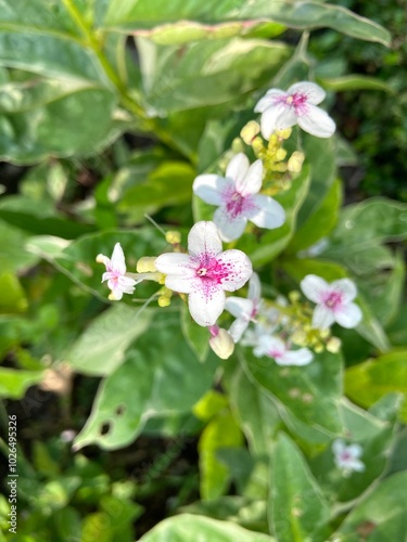 Pseuderanthemum maculatum, commonly known as yellow-vein eranthemum, is in bloom.