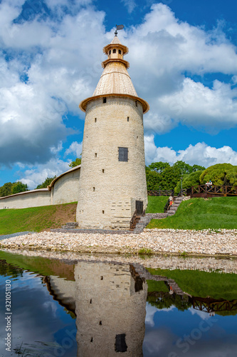 Pskov, High (Voskresenckaya) tower of the Roundabout city at the mouth of the Pskov river