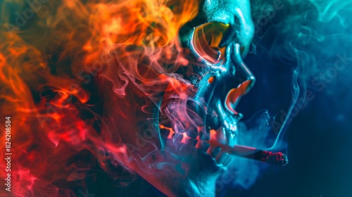 Psychedelic close-up, person exhaling colorful smoke, skull shapes in the smoke, dark, mysterious background
