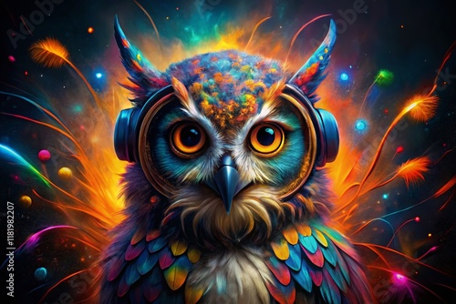 owl, hallucinogen, earphones, long exposure, art, abstract, animal, bird, fantasy, surreal, vibrant, colourful, cosmic, digital artwork, wallpaper, background, texture, design, illustration, graphic, poster, canvas, print, painting, artwork, image, photo, photo, creative, imaginative, mystical, magical, nocturnal, wisdom, night, music, audio, listening, colours, pattern, shape, detail, resolution