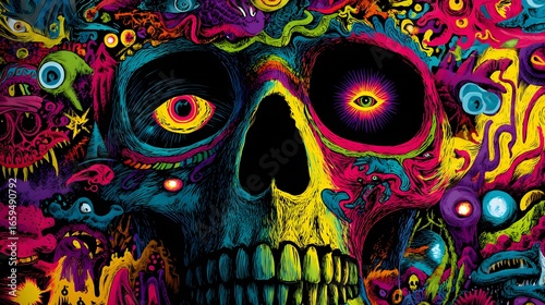 Psychedelischer Totenschädel mit bunten Augen und surrealen Mustern