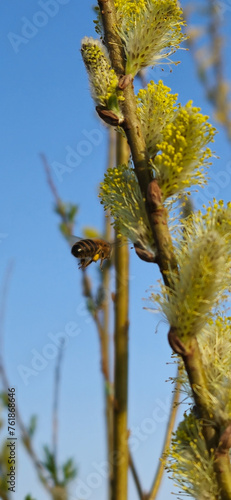 Pszczoła leci na tle nieba w kierunku kotków wierzby