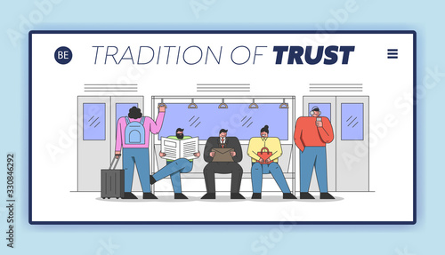 Public Transport Concept. Website Landing Page. People Ride Metro On Their Way. Men and Women in The Public Transport. Urban Transportation. Web Page Cartoon Linear Outline Flat Vector Illustration